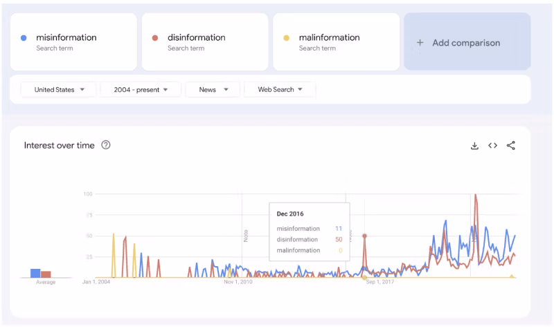 Η ιστορία της «παραπληροφόρησης», της «παραπληροφόρησης» και της «κακοπληροφορίας» είναι ενδιαφέρουσα. Αυτή η χρονική γραμμή από Τις τάσεις της Google τεκμηριώνει γραφικά τη γένεση των αιχμών στη χρήση αυτών των όρων: