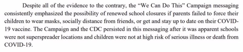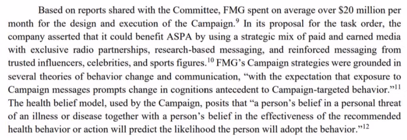 Το HHS ανέθεσε σε μια εταιρεία δημοσίων σχέσεων, την Fors Marsh Group (FMG), την προπαγανδιστική εκστρατεία. Ο κύριος στόχος ήταν η αύξηση της διάδοσης του εμβολίου κατά της Covid. Η στρατηγική: 1. Υπερβολή του κινδύνου θνησιμότητας από Covid 2. Υποβάθμιση του γεγονότος ότι δεν υπήρχαν βάσιμες ενδείξεις ότι το εμβόλιο κατά της Covid σταματά τη μετάδοση.