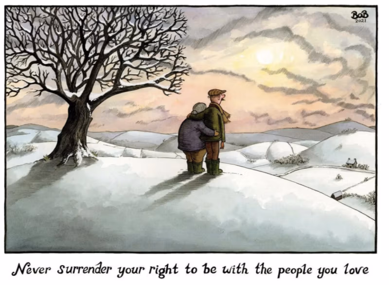 Η φήμη του Μπομπ για δίκαιη αντίσταση στους περιορισμούς της Covid αυξήθηκε χάρη σε ένα μπομπμορανγκέτσιτ hashtag. Και έτσι ο Μπομπ Μόραν το κατάλαβε – τα πλούσια περιγράμματα του πρώτου του ανεξάρτητου καρτούν διαπερνούν τις συσσωρευμένες πολυπλοκότητες των μηνυμάτων για την Covid με μια δήλωση καυτής απλότητας: υπάρχουν άνθρωποι και μέρη που είναι δικά σου και για σένα, πάντα.